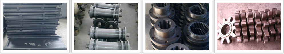 此外,還有供推移輸送機用的液壓千斤頂裝置和緊鏈時用的緊鏈器等附屬部件。機頭部由機頭架、電動機、液力偶合器、減速器及鏈輪等件組成。中部由過渡槽、中部槽、鏈條和刮板等件組成。機尾部是供刮板鏈返回的裝置。重型SGD320/15刮板輸送機的機尾與機頭一樣,也設有動力傳動裝置,從安設的位置來區分叫上機頭與下機頭。