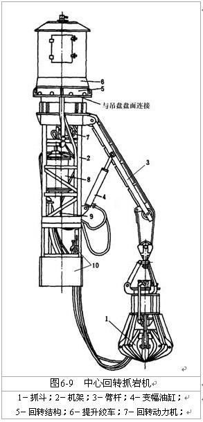 中心回轉抓巖機是一種大斗容抓巖機,它直接固定在鑿井吊盤上,以壓風作為動力,該設備具有使用范圍廣、適應性強、設備利用率高、動力單一、結構緊湊、占用井筒面積不大,便于井筒布置、安全可靠、操作靈活、維護方便等優點,目前在煤炭礦山得到了普遍的使用。該機由抓斗、提升機構、回轉機構、變幅機構、支撐系統和機架等部件組成,見圖6-9。